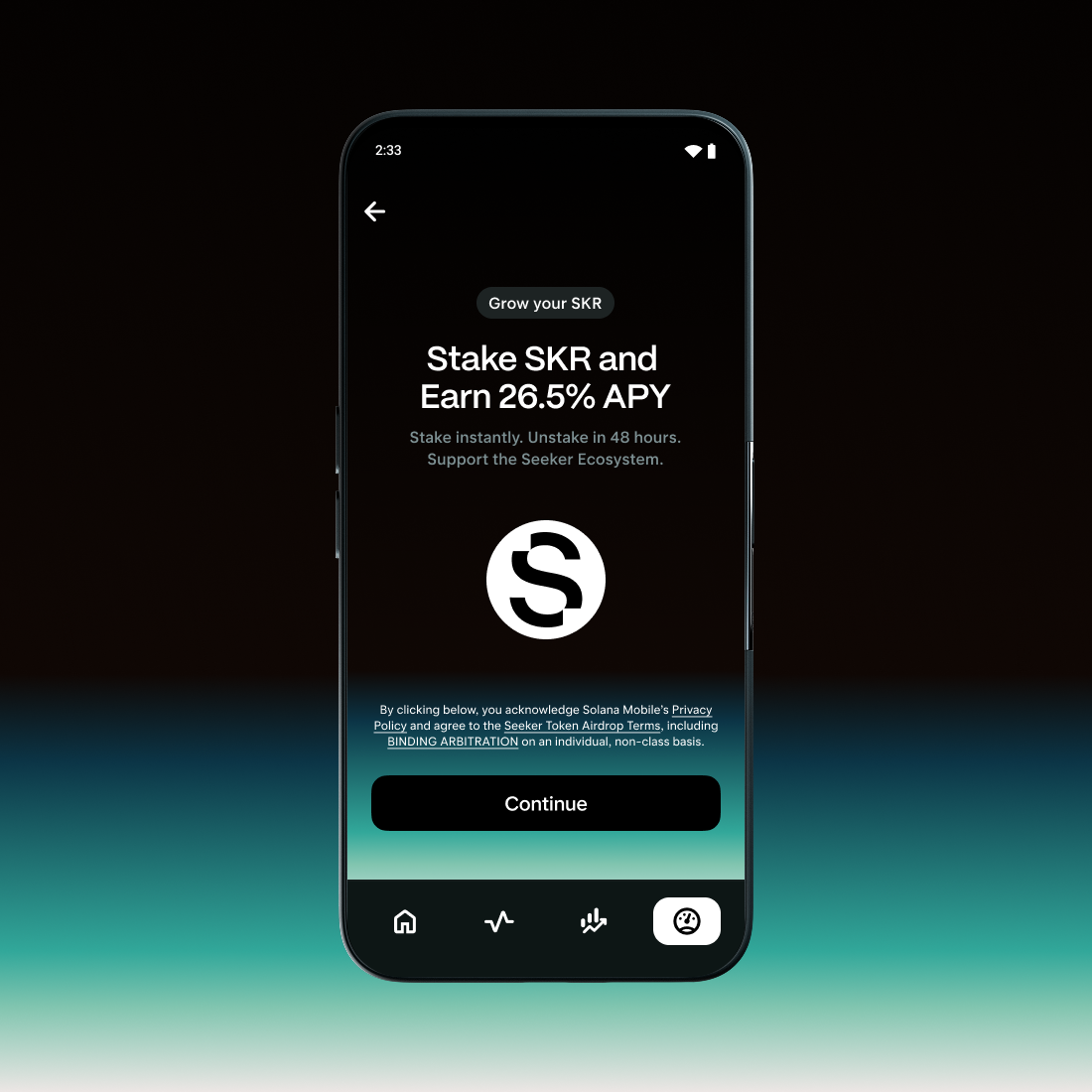 Once claimed, you can stake your SKR to earn rewards and support the Solana Mobile platform. Staked SKR starts earning immediately, with inflation events every 48 hours and 0% commission upon launch.