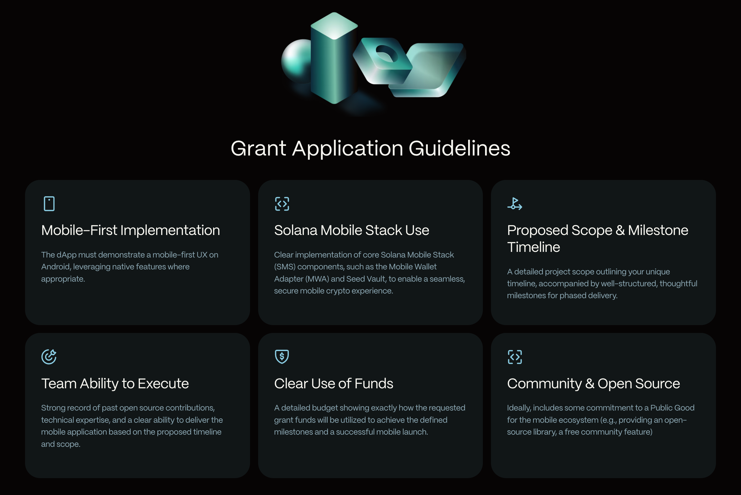 - Strong teams matter. Successful applicants usually demonstrate a clear ability to execute and a commitment to contributing something meaningful to the broader Solana Mobile ecosystem, whether that's through developer tooling, consumer experiences, or infrastructure. We are also very open to supporting teams that are expanding from Ethereum, EVM chains, Cosmos, Polkadot, Near, Aptos, Sui, or other Layer 1 and Layer 2 ecosystems and want to integrate their product with Solana Mobile — if you've been building elsewhere and see a growth opportunity on Solana, we want to hear from you.